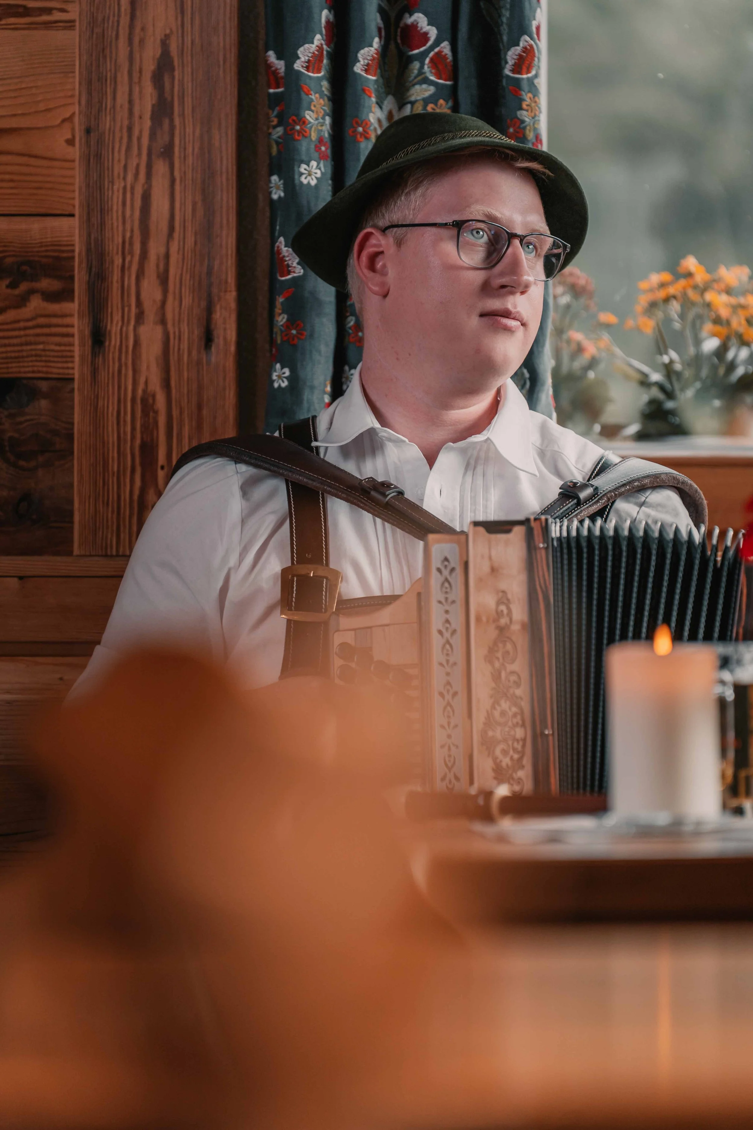 Diatonische HarmonikaSchorschi ist seit 2015 mit dabei und führt den originalen Koitaboch-Musi‑Stil zeitgemäß weiter. Mit Gespür für Sound und Technik sorgt er dafür, dass musikalisch alles rund läuft. Und auch beim Auto einräumen behält er zuverlässig den Überblick.